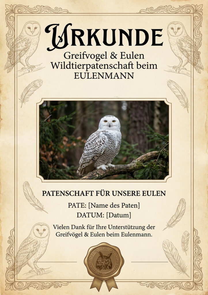 Eine offizielle Urkunde vom Eulenmann über Ihre Wildtierpatenschaft für das aktuelle Jahr.
